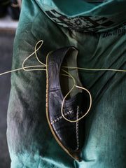 Through WhatsApp, I suggested he make me a new pair, but with a few modifications. No curly toe, no patterns across the top, and a few other changes to the silhouette and pattern, which I communicated with the Turkish I had learned while living in Istanbul. I was quickly learning new words -- footwear was not a category of vocabulary I studied. I then sent him a really high quality piece of black leather with a beautiful texture and asked him to add a rubber sole to the bottom of the shoe for better grip and durability.