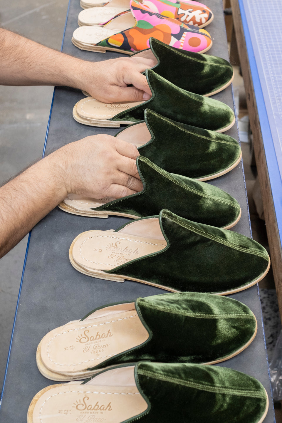 These Babas are produced at the Sabah Workshop in El Paso, Texas. They are not your typical slippers! We use natural, high quality leathers, including a very special undyed vegetable tanned leather lining so that the Baba will form to the foot over time. El Paso has enabled us to utilize materials from all over the world, in the case of our Velvet Babas, a 100% viscose velvet fabric from one of the best Italian suppliers. Each pair is thoughtfully created by hand and by name, from concept to execution.