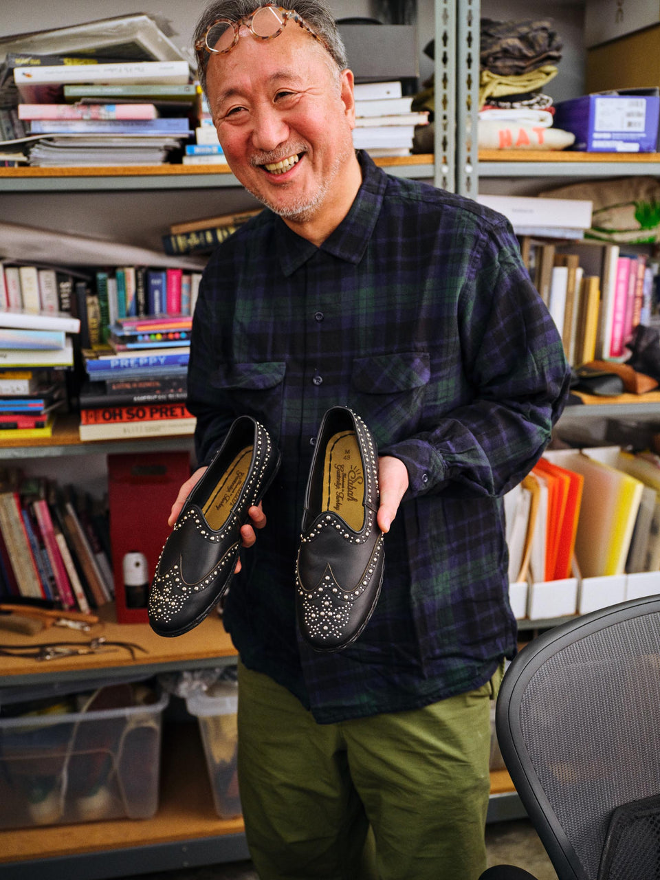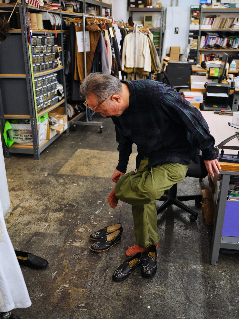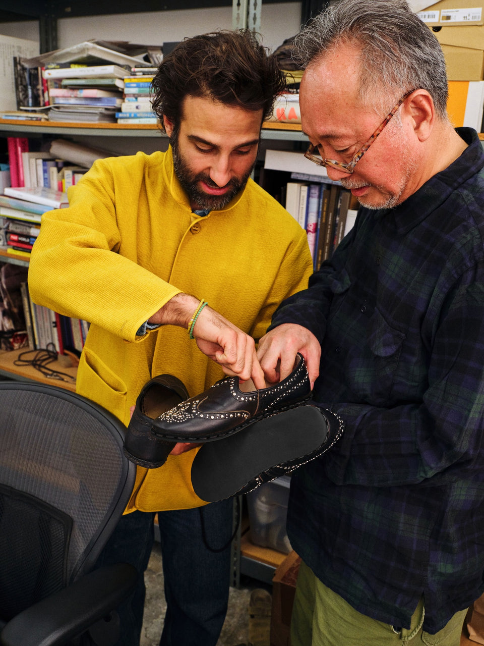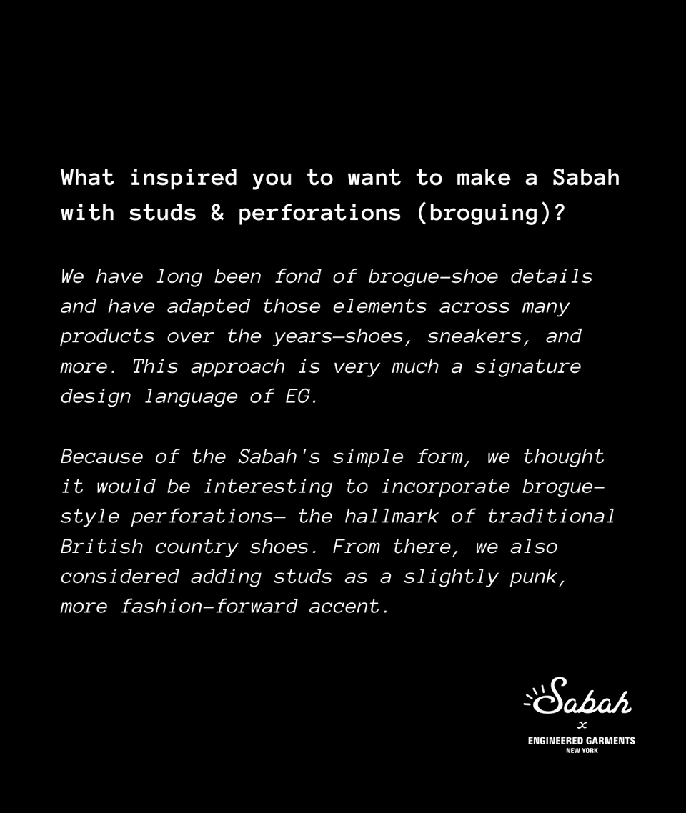 Designed in collaboration with Engineered Garments, these studded Sabahs are truly one of a kind. Inspired by traditional English footwear, the decorative brass and steel studs shine over a classic wingtip design and intricate broguing. These Sabahs feature a 'black out' aesthetic with all black soles, stitching, and rubber outsoles for a refined and sleek look. This is the first time we've ever introduced this on our Sabah silhouette. Each pair is handmade one at a time in our Workshop in Gaziantep, Turkey. Enjoy!