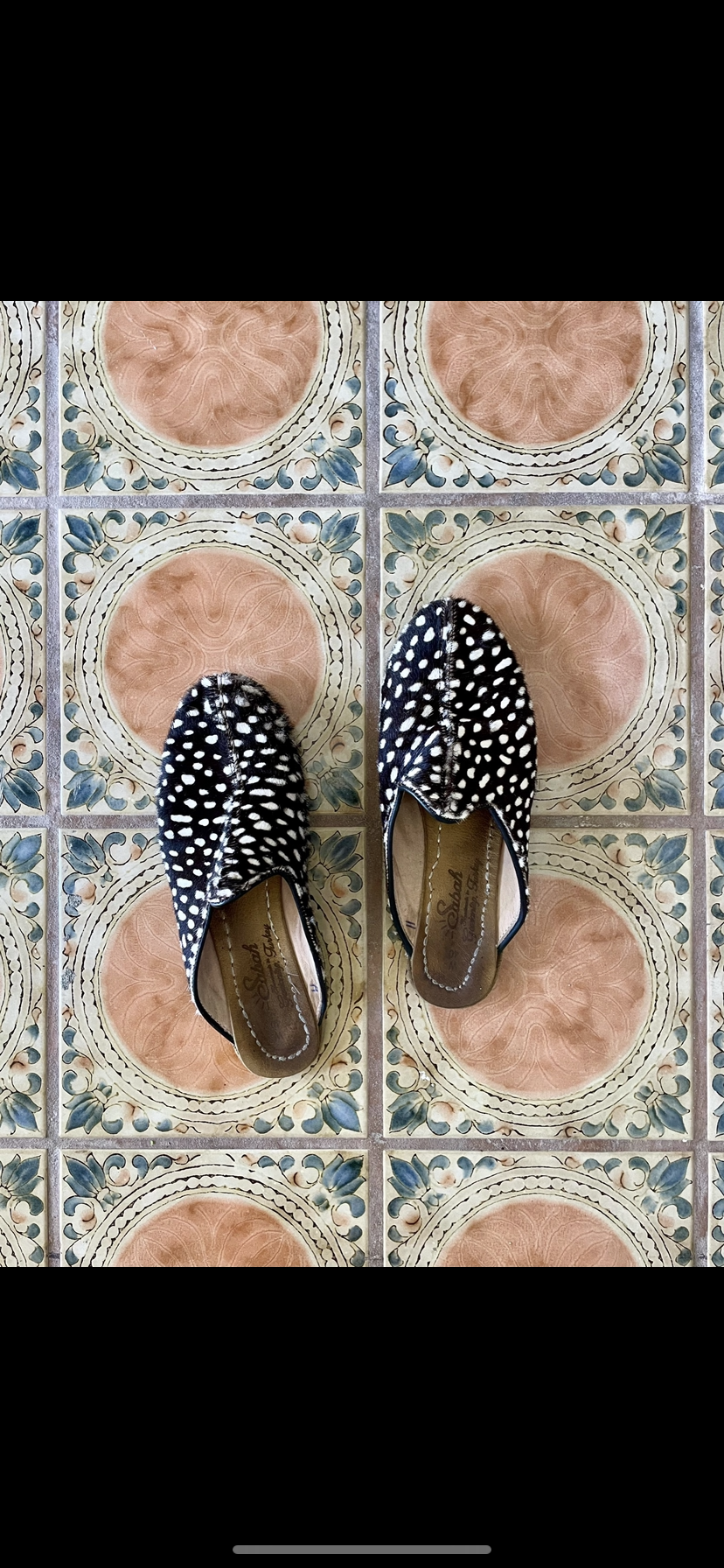Our beloved Felli Red leather is now available in backless Baba form -- a lightly pebbled, soft, bright red leather with a distinct cream piping -- perfect for summer strolls or lounging around the house. Enjoy!