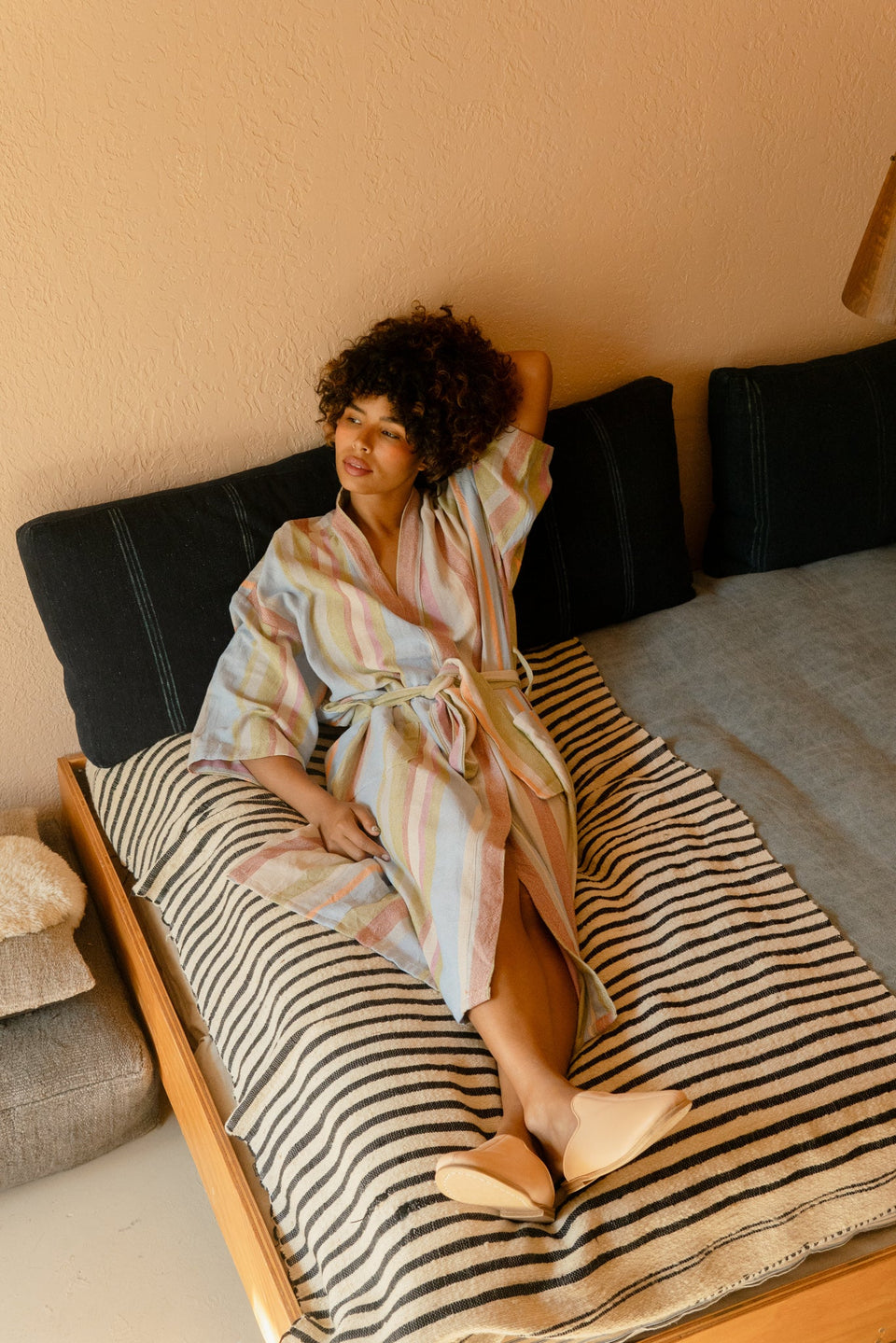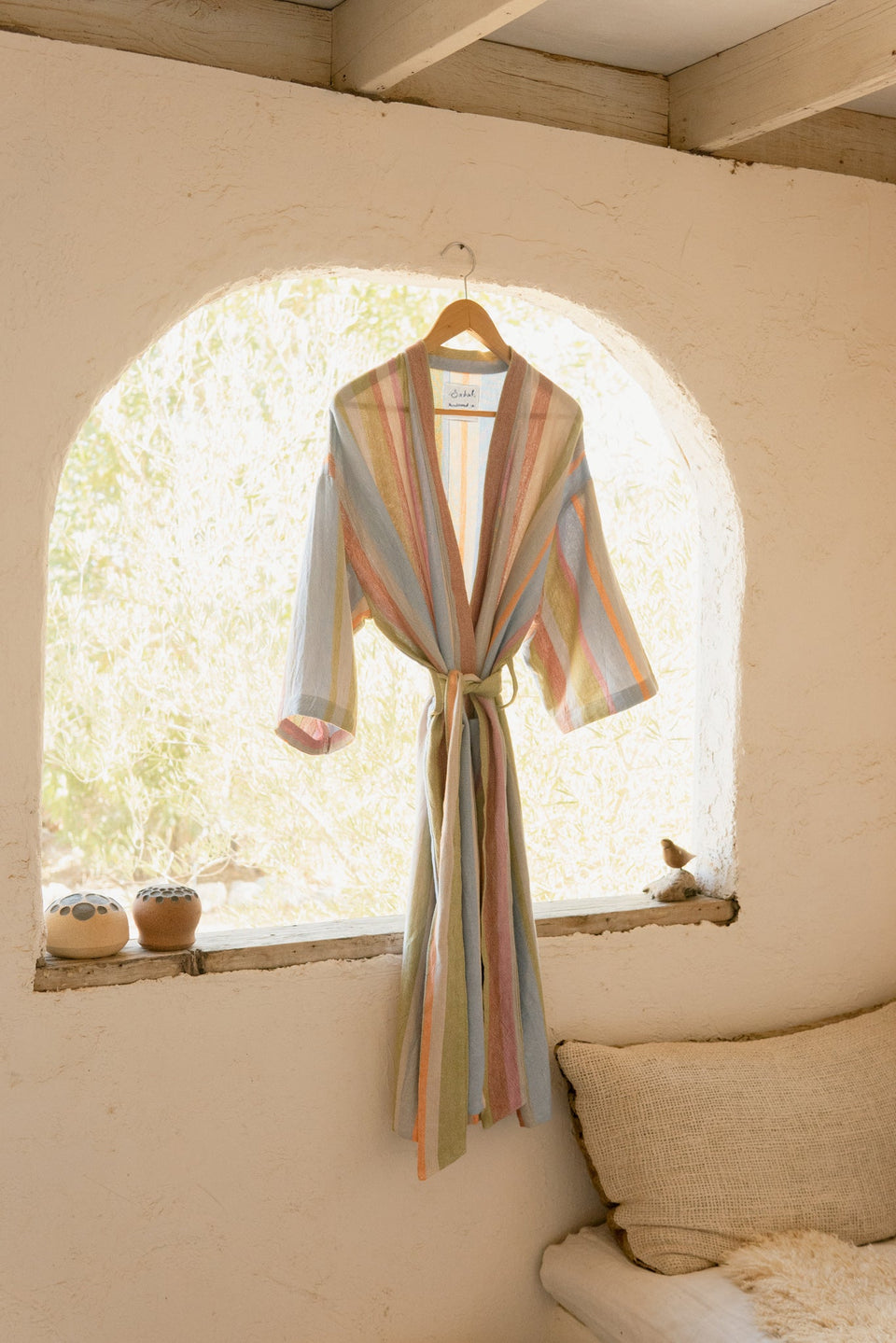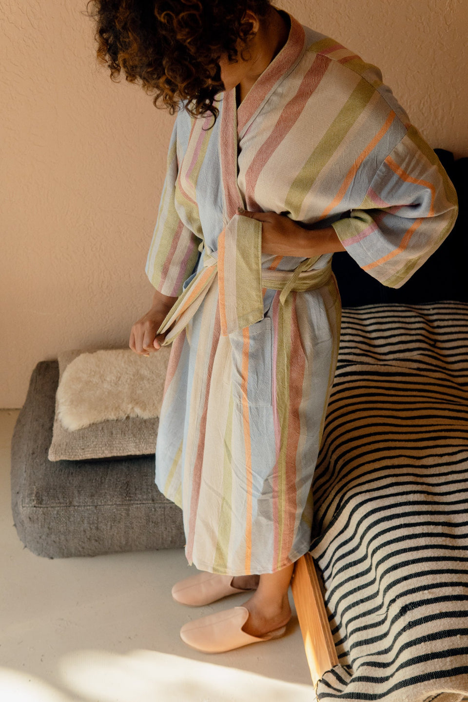 One Week Delivery Our Hatay Robe is made by artisans in southeastern Turkey of a 100% cotton, handloomed textile produced just for Sabah. Our Limeni colorway features multiple muted stripes that'll look as great on body as hanging up in your bathroom. Soft to the touch in a medium weight, this is an all-year-round robe. With a slightly dropped shoulder, wide sleeves, and oversized hip pockets, it's one size fits most. Enjoy!