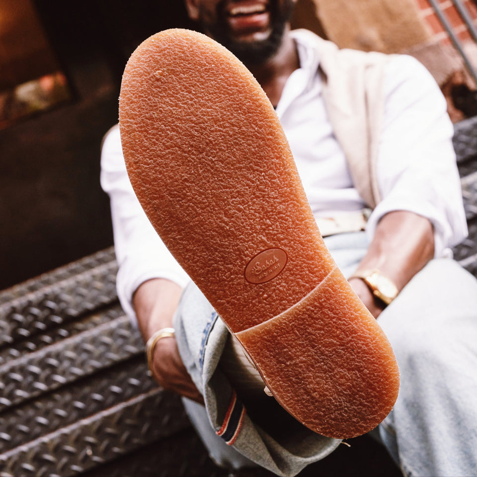 The rubber that we use for the outsoles of our Sabahs is Thermoplastic Rubber (TPR). We use this soft and thin rubber as to not impede the leather sole from forming to your feet.